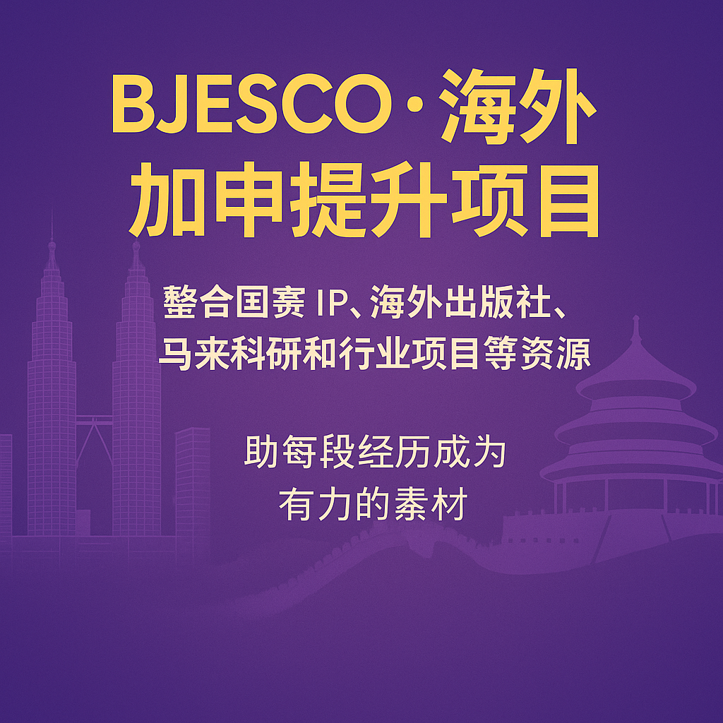 BJESCO 留学背景提升项目,以“真实能力提升,而不是包装履历”为核心,整合国赛 IP、海外出版社、马来西亚科研与产业项目等资源,为计划申请海外大学的学生提供科研课题、竞赛实践、出版写作与实战项目一体化规划,让每一段经历都可验证、讲得出口。